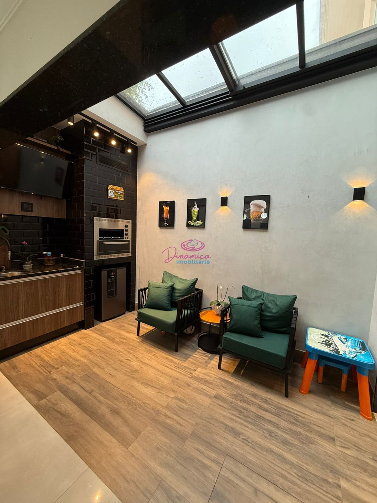Espaço gourmet integrado com churrasqueira e teto retrátil